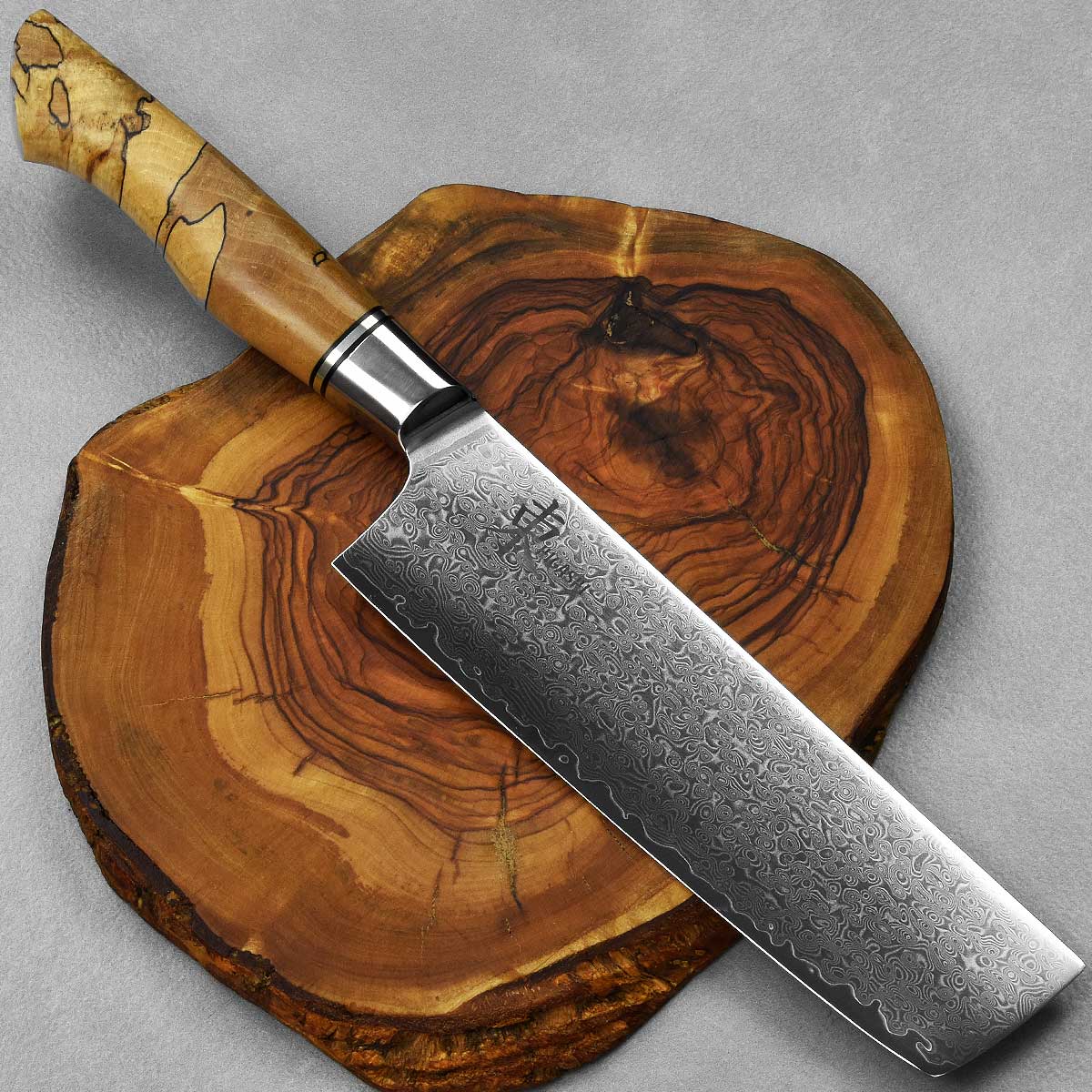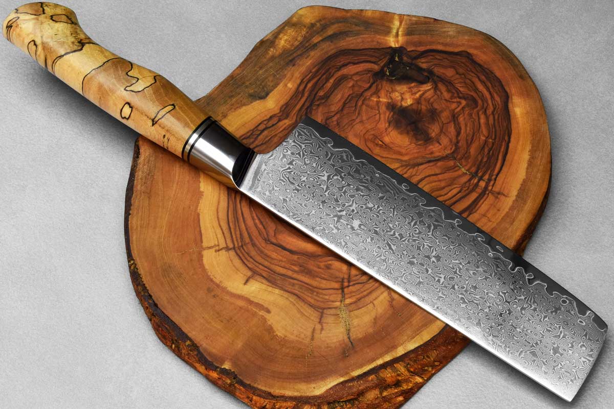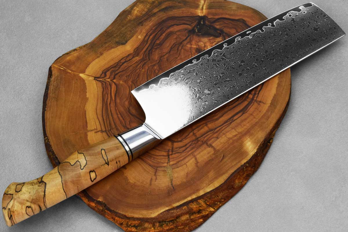 הלהב של הסכינים מחושל מפלדת אל-חלד איכותית מסוג 10Cr15CoMoV, בגימור של פלדת דמשק בדוגמה מרהיבה. הלהב גבוה ומאפשר עבודה קלה גם עם חומרי גלם גדולים. ההשחזה (Grind) של הסכין דקה ומאפשרת חיתוכים חדים ומדויקים. הידית עשוייה Spalted Maple.